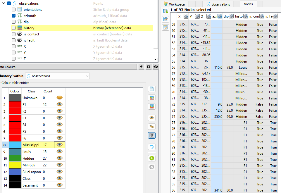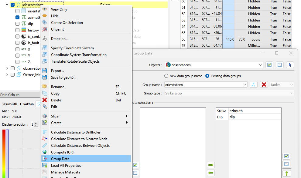 Both the azimuth and dip channels can then be collected into a group by right-clicking the observations object, selecting Group Data and choosing one of the special types Strike & dip or Dip direction & dip.