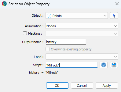 The history is represented by a reference data object and is created by providing a string in the script dialogue. The string should contain the name of the event that the point is describing.