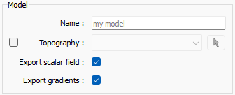 Topography may be used to clip the top of the model by selecting a surface in the Topography field. Optionally, the scalar field and its gradient may be returned by checking the Export scalar field and Export gradients boxes. For the scalar field options, the mesh will contain a model displaying the scalar field in each cell.