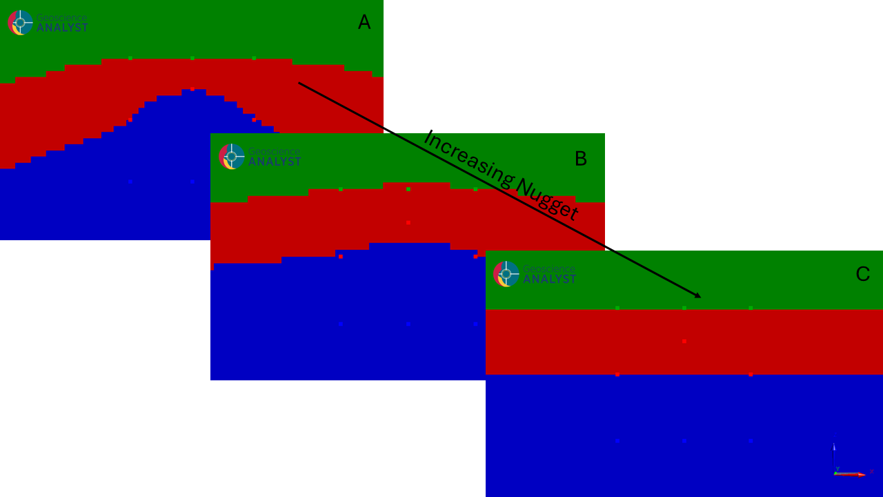 The default nugget value is small and forces the model to fit the outlier contact point (A). In some cases, this may not be desired as observations can be noisy and potentially erroneous. By increasing the nugget, the fit to the contact points will be relaxed and result in something like a ‘best fit’ middle layer interface (B). As the nugget increases further, the model will tend towards fitting the orientation data. Since the example uses a single flat orientation data marker, the model will tend towards horizontal bedding (C).