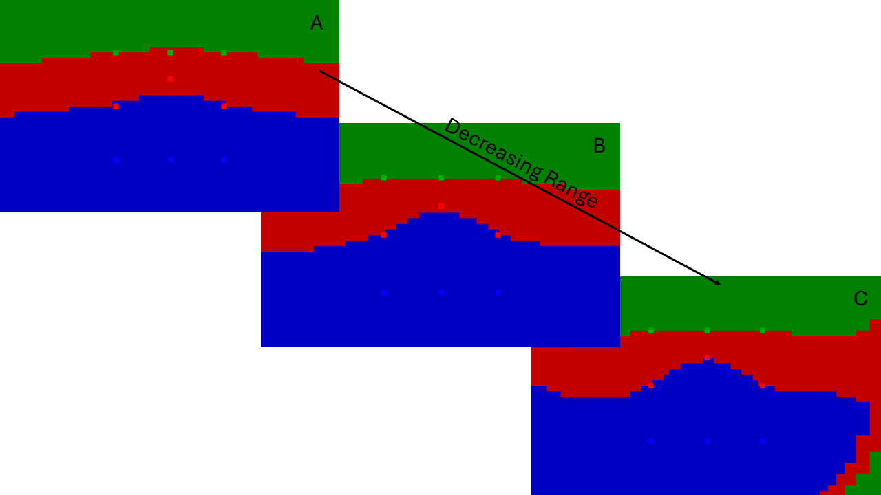 The range parameter controls how much surfaces can bend to fit the observations. The default value is 1.7, which is a good moderate value for many models when accompanied by the default nugget value. In cases where the model cannot fit contact points at a given nugget value, decreasing the range may help improve the fit. In the example below we demonstrate the effect of decreasing the range for the same set of observations as above, but with a large nugget effect such that the default range (A) fails to accurately fit the outlier contact point. Decreasing the range at the same nugget value allows the middle layer interface to bend in order to fit the outlier more closely (B). Further decreasing the range allows the fit to improve, but results in unjustified bending in the corners of the model (C).