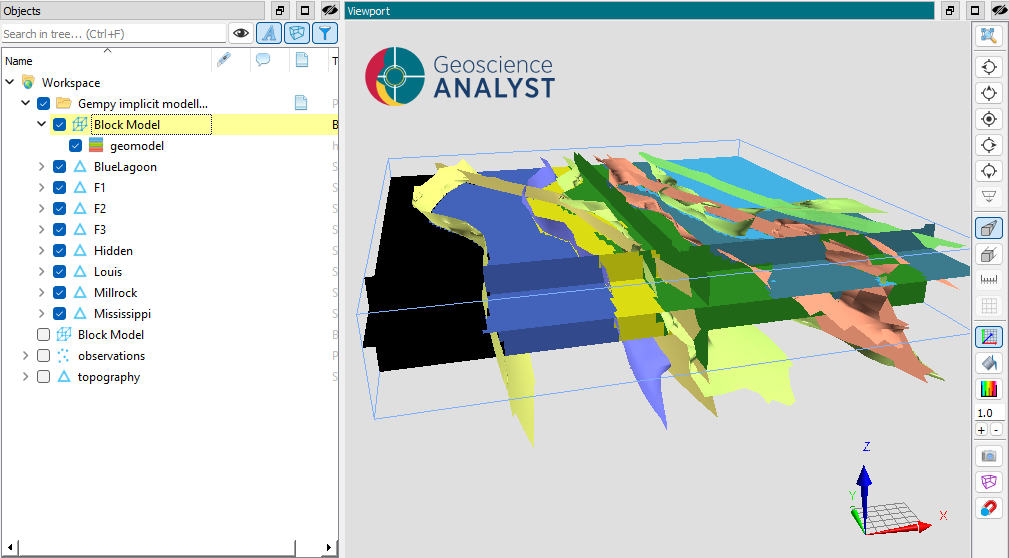 The output of the gempy-drivers is a geological unit model, stored as Referenced data on the input mesh, and a set of surfaces that describes the geological model. The surfaces and model are stored in a UIJson group container.